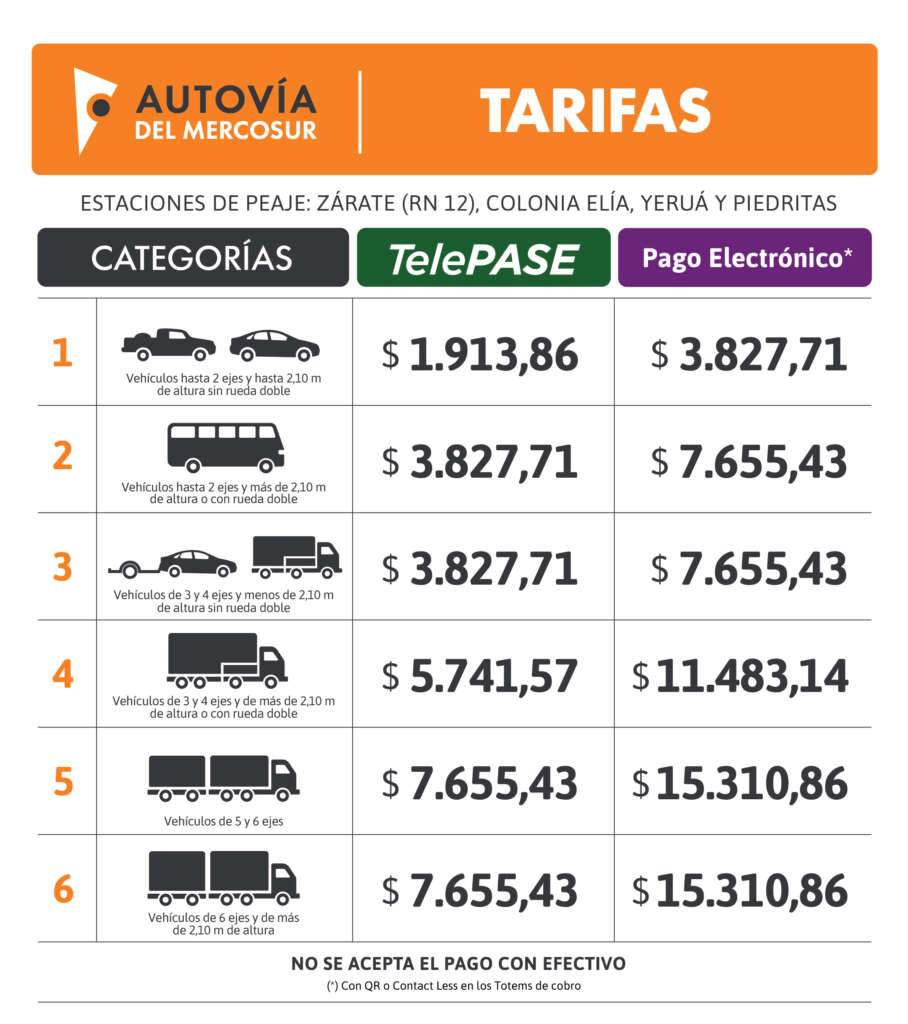 El cuadro tarifario es válido para las Rutas Nacionales Nº 12 y Nº 14, y el complejo de vinculación Zárate–Brazo Largo, la RN 135, la RN A-015 y la RN 117